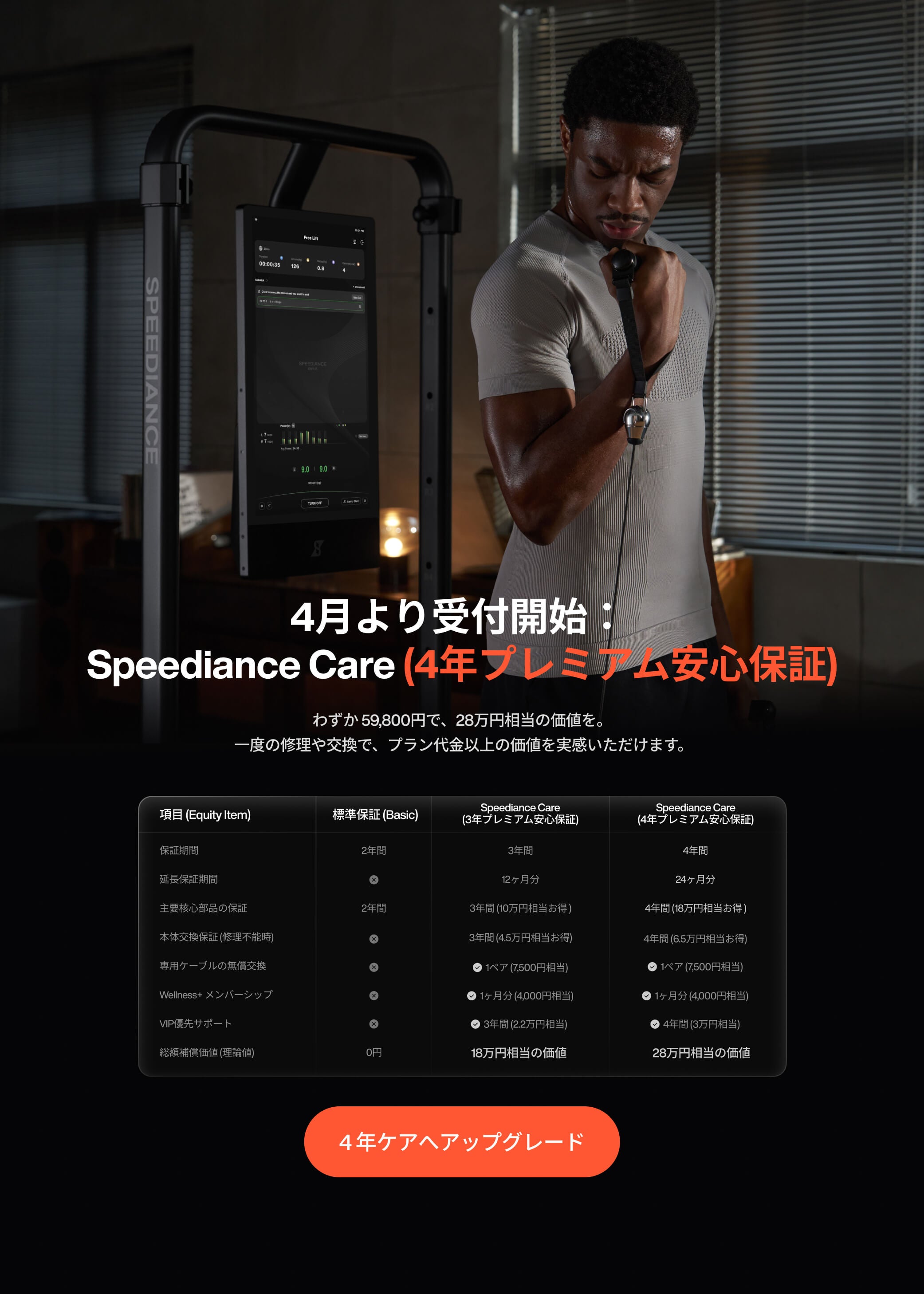 AIを活用した未来のフィットネスを築くため、私たちは最新のAI技術を製品に取り入れ、一流トレーナーとの連携を強化し、より質の高いサービスを提供していきます。そこで本日、すべてのSpeedianceユーザーの皆さまに向けたプレミアムサービス「Wellness+」をご紹介します。お使いのSpeediance製品に関わらず、Wellness+があなたのフィットネス体験をさらに高めます。