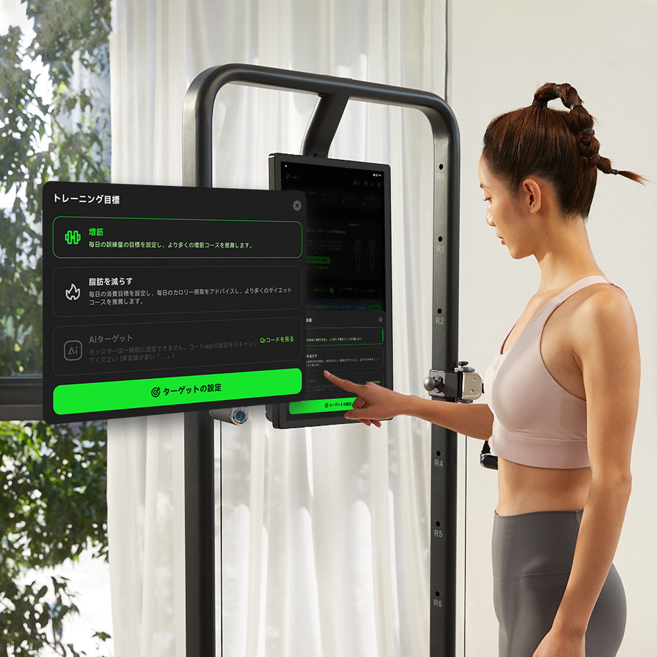 AI推奨重量機能が瞬時に1RMを計測・更新し、最大能力を引き出すスマートな負荷調整を実行します。