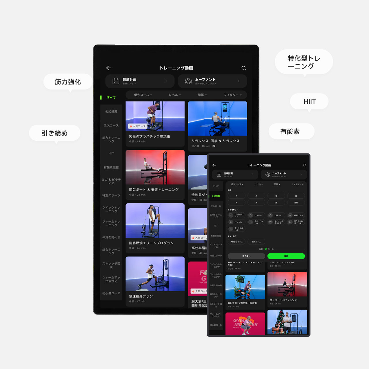 プロコーチが監修した10種類以上のコースで、全身から特定部位集中トレーニングまで幅広く対応します。